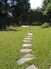 We created a main patio and entertaining space next to the living area, which contains a water feature providing a complementary backdrop to the sounds of nature. A slate step stone path leads down to a sunny wrought iron arbor up which scented climbers and Clematis are trained. This is a wonderfully private and tranquil spot.